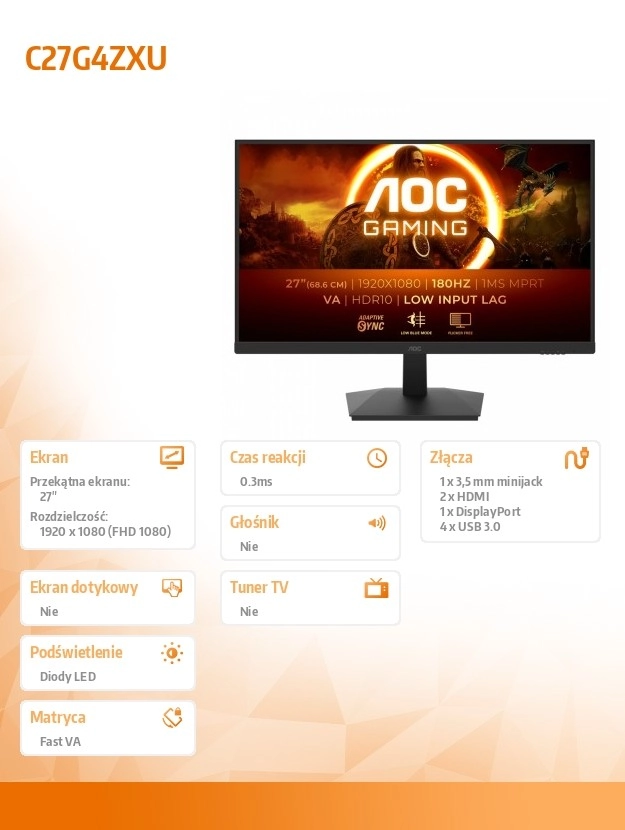 - Fast VA panel – vysoký kontrast, syté barvy a hluboká černá pro lepší atmosféru.