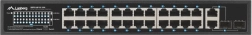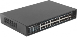 24 portů PoE+ 10/100 Mb/s napájí i přenáší data po jednom kabelu. Reálný rozpočet 250 W umožní současně napájet až 16 zařízení 802.3af (15 W/port) nebo 8 zařízení 802.3at (30 W/port).