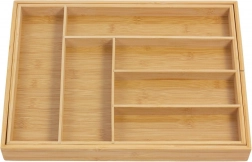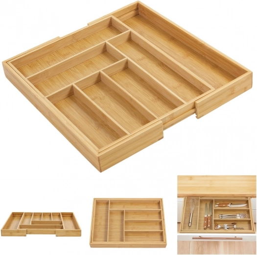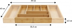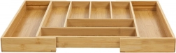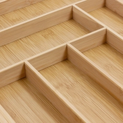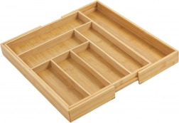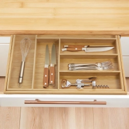 Udržte si pořádek v kuchyni s univerzálním bambusovým pořadačem, který se přizpůsobí vaší zásuvce. Rozšiřovací boční části vytvářejí další prostor a spolu s pevnými dělicími přepážkami udrží vše přehledně na svém místě. Přírodní vzhled z masivního bambusu se hodí do moderních i klasických interiérů.