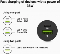 Objevte výkon a kompaktní rozměry v jednom. Autonabíječka GREEN CELL PowerRide Nano38 s celkovým výkonem 38 W kombinuje USB‑C PD 20 W pro moderní telefony a tablety a USB‑A 18 W Ultra Charge pro rychlé dobíjení vaší výbavy. Minimalistický design s hliníkovou konstrukcí skvěle zapadne do interiéru každého vozu.
