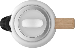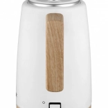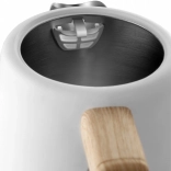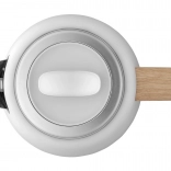 Bílá matná povrchová úprava s dřevěnými prvky působí čistě a nadčasově. Konvice se stane stylovým doplňkem každé kuchyně.