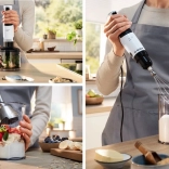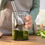Sekáček a šlehací metla rozšíří možnosti přípravy – od nasekaných bylinek po nadýchané krémy. Odměrná nádoba usnadní míchání menších porcí.