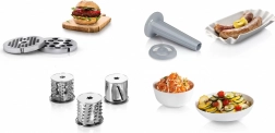 Nejenže míchá maso, ale tento mlýnek zvládá i krájení a strouhání různých surovin, jako jsou zelenina a ovoce. Díky tomu je ideálním pomocníkem pro přípravu pokrmů, jako jsou bramboráky nebo šťavnaté hamburgery.