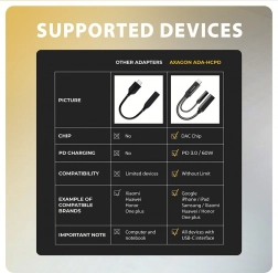 Zvenkovní zvuková karta ADA-HCPD je nejen skvělým řešením pro zařízení bez audio jacku, ale díky Power Delivery 3.0 s výkonem až 60W umožňuje současné nabíjení chytrého telefonu či notebooku, což vás zbaví starostí s neustálým odpojováním sluchátek. Užijte si vynikající zvuk při poslechu hudby, sledování filmů nebo hraní her. Tento adaptér podporuje beztrátové formáty jako FLAC, WMA, WAV, APE, AAC nebo ALAC a je kompatibilní s platformami jako Spotify, Apple Music a dalšími.