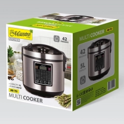 Objevte flexibilní vaření s multicookerem MAESTRO, který kombinuje 5litrovou nádobu s výkonem 900 W a 42 přednastavenými programy. Připravíte polévky, dušená jídla, rýži, kaše, koláče i pokrmy na páře bez složitého nastavování. Odolné provedení z nerezové oceli a kvalitního plastu skvěle zapadne do moderní kuchyně.