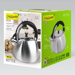 Čajník Maestro disponuje nenahřívající se rukojetí pro pohodlí a bezpečí při manipulaci. Praktický píšťalka oznamuje dosažení varu. Odnímatelné víko usnadňuje nalévání vody a čištění.