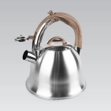 Cajník je vybaven nepálivou rukojetí z materiálu imitujícího dřevo, která zajišťuje komfort a bezpečnost při používání. Píšťalka upozorní uživatele, jakmile se voda uvaří, což je praktické a bezpečné pro každodenní použití. Odnímatelné víko umožňuje snadné nalévání vody a čištění vnitřku, což je pohodlné a hygienické.