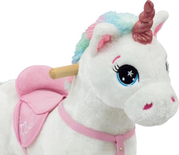 Tento půvabný houpací jednorožec v bílo-růžovém provedení okouzlí každé dítě. Hebký plyš je příjemný na dotek, dřevěná houpací základna poskytuje stabilitu a integrované zvukové efekty podtrhují kouzelný zážitek z jízdy. Ideální pro děti od 3 let, které si chtějí hrát a současně rozvíjet motoriku a rovnováhu.