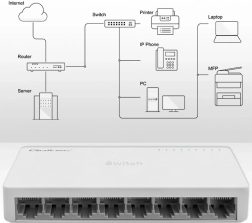 Optimalizovaný hardware se stíněnými porty a kvalitním chlazením zajišťuje stabilitu a nízké rušení i v náročnějších podmínkách. Přepínač podporuje plně duplexní komunikaci dle IEEE 802.3x a řízení toku v poloduplexu, takže efektivně zpracuje datový provoz v celé síti.