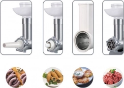 Díky plničce klobás a nástavci na kebbe si vyrobíte domácí uzeniny a orientální speciality. Nepoužívaná sítka uložíte do vestavěného prostoru.