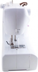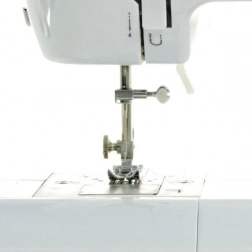 Integrovaný ořez nitě na boku je pro bezpečí opatřen krytkou. Stroj nejlépe pracuje s jednoduchými, tenčími materiály a podporuje rozvoj jemné motoriky, koordinace a fantazie – perfektní volba pro malé tvůrce a společné tvoření doma.