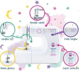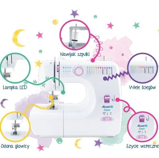 Mini šicí stroj Łucznik Lena 2019 je navržen jako hravý a bezpečný vstup do šití pro děti. Ochranný kryt obklopuje jehlu ze všech stran, což výrazně snižuje riziko poranění prstů. Díky přehlednému ovladači snadno zvolíte rovný steh nebo cikcak, přičemž piktogramy stehů jsou přímo na těle stroje pro rychlou orientaci.