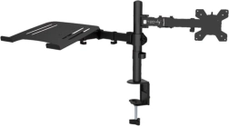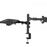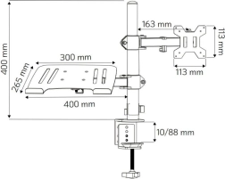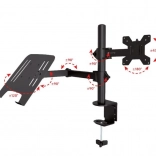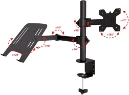 Držák monitoru a notebooku je ideální pro moderní kancelářské prostředí. Umožňuje širokou škálu nastavení, včetně náklonu ±45° pro monitor i polici na notebook, otáčení monitoru o ±180° a police na notebook o ±120°, a možnost otočení monitoru o 360° (PIVOT). Výšku lze nastavit podél 400mm vertikálního sloupku dle vašich potřeb.