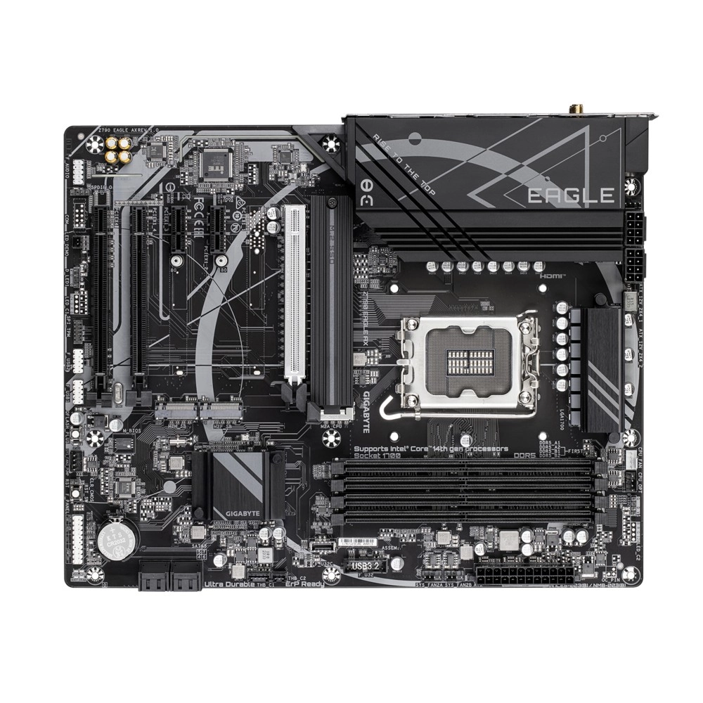 Výkonná základní deska GIGABYTE Z790 EAGLE AX pro procesory Intel Core 12./13./14. generace nabízí stabilní napájení s 12+1+1 fázovým digitálním VRM, rychlou paměť DDR5 (XMP 3.0), trojici slotů M.2 PCIe 4.0, moderní konektivitu 2.5GbE LAN a Wi‑Fi 6E, a také praktické funkce jako EZ-Latch a Q-Flash Plus.