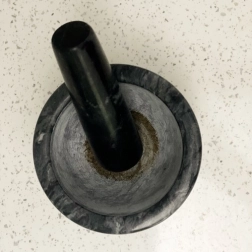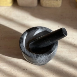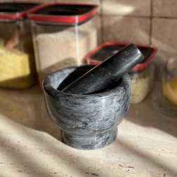 Těžké mramorové provedení (cca 2 kg) zajišťuje, že hmoždíř při drcení neklouže. Přírodní kámen je extrémně odolný vůči prasklinám, poškození a poškrábání – ideální pro každodenní použití.