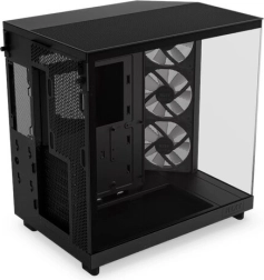 NZXT H6 Flow RGB v černém provedení spojuje elegantní panoramatické zasklení s optimalizovaným prouděním vzduchu. Dvoukomorová konstrukce odděluje zdroj a kabeláž od hlavních komponent, což zlepšuje teploty a udržuje čistý, profesionální vzhled sestavy. Perforované horní a boční panely podporují vysoký průtok a současně zachytávají prach.