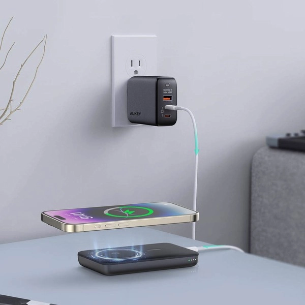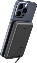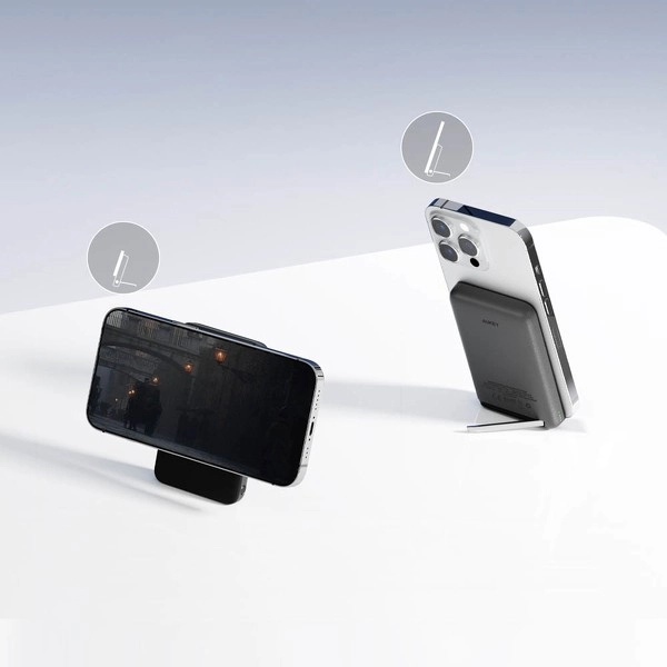 Kompaktní powerbanka AUKEY s kapacitou 6700 mAh podporuje MagSafe bezdrátové nabíjení pro iPhone 12 a novější, rychlé nabíjení až 20 W přes USB‑C, současné nabíjení dvou zařízení, praktický LED indikátor stavu a integrovaný výklopný stojánek pro pohodlné sledování obsahu.
