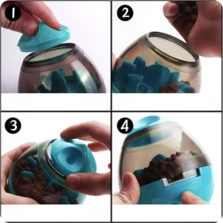 Míček otevřete pootočením, nasypete granule a nastavíte velikost otvoru podle pamlsků i požadované obtížnosti. Jednoduchá obsluha i čištění.