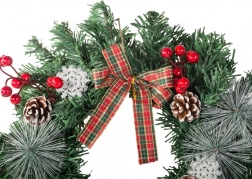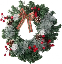Tradiční vánoční věnec z kvalitního umělého jehličí je ozdoben přírodními šiškami, červenými bobulkami, vločkami a stylovou kostkovanou stuhou. Díky realistickému vzhledu a decentnímu ojínění působí autenticky a okamžitě navodí sváteční náladu.