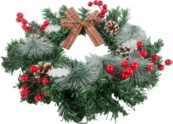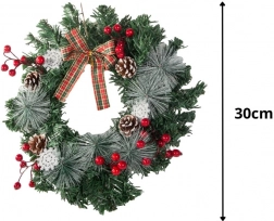 Vneste do svého domova kouzlo Vánoc s tímto elegantním věncem o průměru 30 cm. Kombinace zeleného jehličí s přírodními šiškami, červenými bobulemi, jemným „zasněženým“ efektem a kostkovanou mašlí vytvoří útulnou sváteční atmosféru na dveřích, zdi i v okně. Lehká konstrukce a odolné materiály zajistí snadné zavěšení i dlouhou životnost uvnitř i venku.