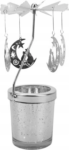 Náš otáčecí svícen je designován ve tvaru květináče a vyznačuje se unikátním závěsem s 4 měsíci, které se elegantně otáčejí kolem své osy při teplu z hořící svíčky. Blýskavé plíšky zachytávají světlo svíčky, což vytváří nádherný vizuální efekt. Díky možnosti umístění na rovný povrch se stane skvělou dekorací nejen o svátcích.
