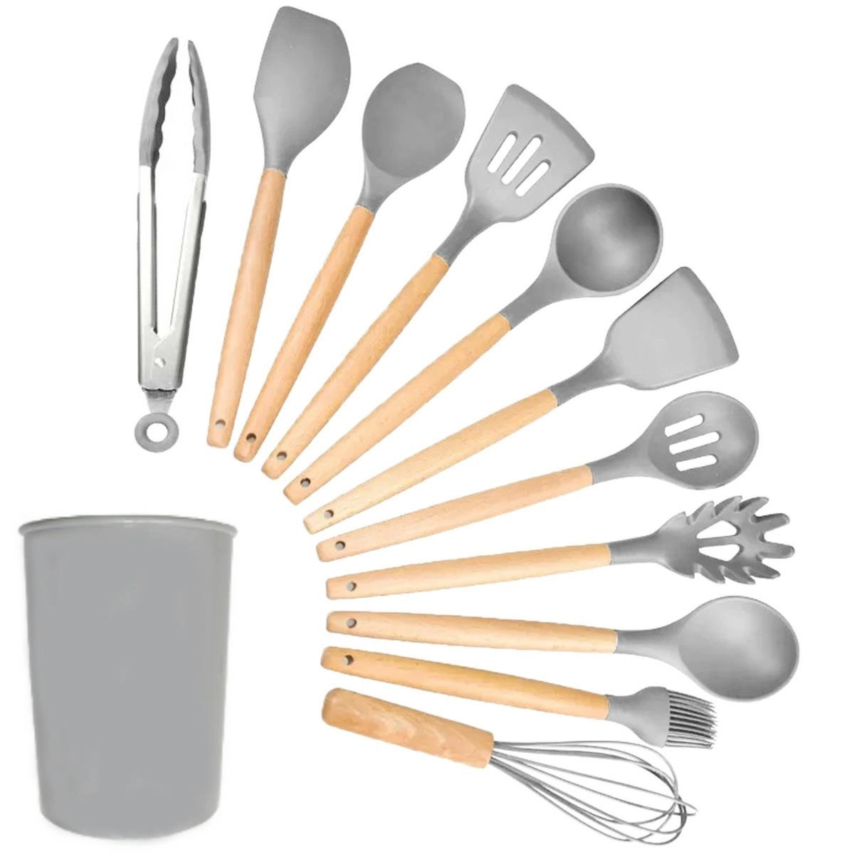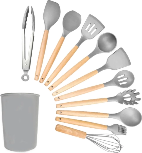 Materiál: dřevo + silikon TPE pro nástroje a PP plast pro nádobu. Odolává vysokým teplotám a je navržen pro dlouhou životnost.
