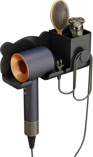 Praktický nástěnný držák na fén ušetří místo v koupelně a udrží vše po ruce. Nabízí snadnou neinvazivní montáž pomocí oboustranné pásky, má dvě přihrádky na doplňky a přední háček na kabel či houbičku. V elegantní černé barvě ladí s moderním interiérem.