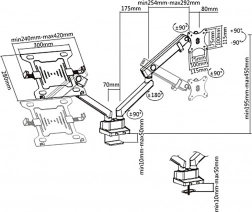 Je vybaven základnou pro laptop, což zlepšuje komfort a ergonomii práce. Vysoce kvalitní hliníková ramena jsou vybavena odolnou montážní svorkou, která umožňuje upevnění ke stolu nebo jiným rovným plochám bez nutnosti vrtání. Ideální řešení pro použití v kanceláři i doma.