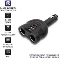 Rozšiřte možnosti napájení ve svém autě. Rozdvojovač Qoltec kombinuje moderní design a funkčnost: dvě samostatné zásuvky zapalovače ponechají plnou možnost využití auto příslušenství, zatímco USB porty s podporou Quick Charge 3.0 a Power Delivery zajistí rychlé a efektivní nabíjení vašich zařízení.