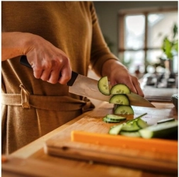 Ergonomická rukojeť opatřená SoftGrip povrchovou úpravou zajišťuje pevný úchop, zatímco velká ochrana na prsty zvyšuje pohodlí a bezpečnost. Nůž je snadno omyvatelný a vhodný do myčky nádobí. Perfektní nůž pro moderní kuchaře hledající kvalitu a všestrannost.