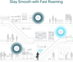 Platforma Omada SDN umožňuje centralizovanou správu v cloudu, inteligentní monitoring a snadné nasazení napříč pobočkami. Funkce Mesh minimalizuje kabeláž, plynulý roaming udrží hovory i video bez přerušení a PoE+ (802.3at) zjednodušuje instalaci na strop či stěnu. Bezpečnostní prvky jako WPA3, síť pro hosty s portálem (SMS/Facebook) a až 16 SSID chrání vaši síť i data.