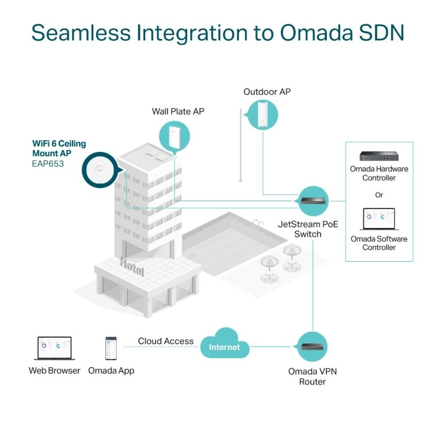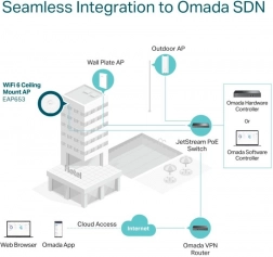 TP-Link Omada EAP653 UR AX3000 je elegantní stropní či nástěnný Wi‑Fi 6 access point pro kanceláře, hotely i školy. Díky širšímu kanálu HE160 (160 MHz) a moderním technologiím Wi‑Fi 6 zvládá více současně připojených zařízení s vyšší rychlostí a nižší latencí. Integrace do Omada SDN přináší jednotné, lokální i vzdálené cloudové řízení přes web nebo aplikaci Omada.