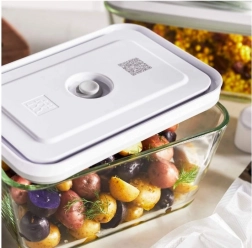 Vakuové balení chladicího zařízení připomínající radost - čím nás ještě může překvapit tato neobvyklá vakuová nádoba ZWILLING Fresh & Save? Například tím, že je vhodná pro použití v mrazničce, troubě, mikrovlnné troubě i myčce nádobí. Je k dispozici ve třech velikostech: S, M a L, takže ji lze dokonale přizpůsobit potřebám a velikosti nádobí nebo výrobků, které chcete skladovat. Lahodné polévky, křupavé saláty nebo snad stále módnější misky z více ingrediencí? Chutné, čerstvé a zdravé jídlo si můžete vychutnat kdykoli během náročného týdne. Pouhým stisknutím tlačítka na vakuové pumpě (nutno dokoupit zvlášť) můžete z vnitřního prostoru odstranit nepotřebný vzduch, čímž si zaručíte mnohem delší (až pětinásobnou!) čerstvost obsahu. Je odolná vůči vysokým teplotám - až 180 stupňů - a je ideální pro ohřev malých, jednotlivých porcí pokrmů. A co víc? Inovativní řešení, propojení výrobků prostřednictvím QR kódu se speciální bezplatnou aplikací ZWILLING, která vám umožní sledovat a připomínat datum čerstvosti držených pokrmů. Vakuová dóza ZWILLING Fresh & Save je nádobí, které vám usnadní každodenní život tím, že vám umožní jíst zdravá, čerstvá a pravidelná jídla po celý den.