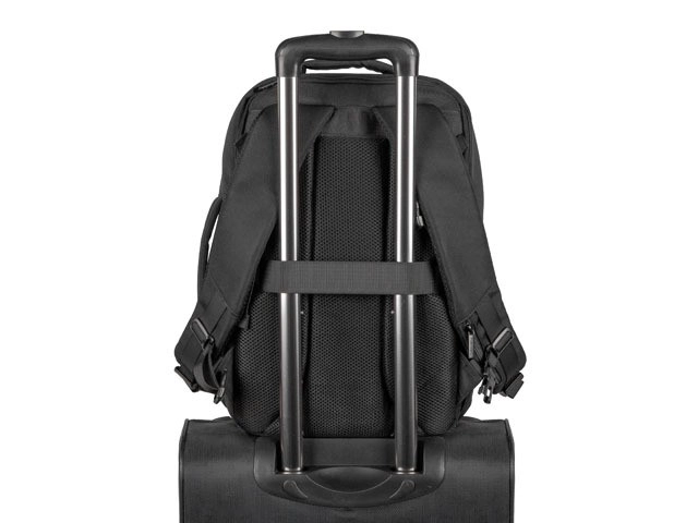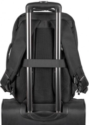 Ventilovaná záda, nastavitelné popruhy s hrudním páskem a pásek pro upevnění k teleskopickému madlu kufru.