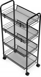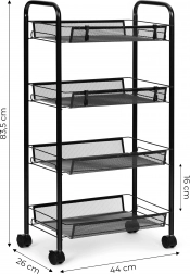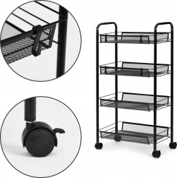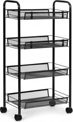 Stylový a praktický pojízdný regál modernhome je navržený tak, aby efektivně využil i úzké prostory a udržel vaše věci přehledně po ruce. Čtyři kovové koše poskytují skvělou ventilaci a viditelnost uložených věcí – od potravin a kuchyňských doplňků přes kosmetiku a ručníky až po kancelářské potřeby a hobby pomůcky.