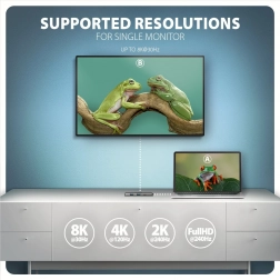 HDMI výstup zajišťuje kvalitní obraz až do rozlišení 8K/30Hz a 4K/120Hz Ultra HD, včetně vícekanálového zvuku. Podporovány jsou vysoké obnovovací frekvence v populárních herních rozlišeních až do 240Hz. Pro správnou funkci je vyžadován port USB-C nebo Thunderbolt 3/4 s aktivním režimem DisplayPort (DP Alt Mode).