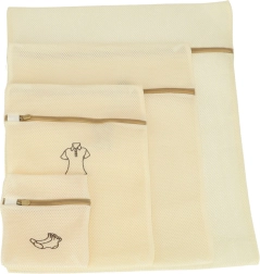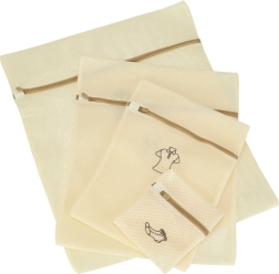 Univerzální sada sáčků na praní je ideální pro ochranu jemných tkanin v pračce. Každý sáček má jinou velikost a piktogram pro snadný výběr, takže bez obav vyperete spodní prádlo, podprsenky, punčochy i větší kusy oděvů. Pevná síťovaná textilie umožňuje účinné praní bez zanášení a chrání látky před zatržením a deformací.