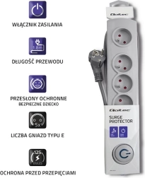 Praktická přepěťová prodlužovací zásuvka se 5 zásuvkami, kabelem 1,8 m a podsvíceným nožním vypínačem pro rychlé vypnutí/zapnutí. Elegantní šedý design, možnost montáže na nábytek a navinutí přebytečného kabelu. Bezpečnost zajišťují přepěťová ochrana, dětské clony a nehořlavý materiál.