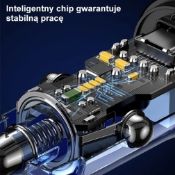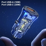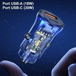 Design s průhledným vzhledem zdůrazňuje precizní komponenty této autonabíječky. Nabíječka poskytuje dva nezávislé porty pro rychlé nabíjení, které podporují následující protokoly: QC, AFC, SCP, FCP a Apple2.4.