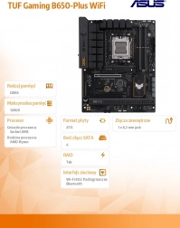 ASUS TUF GAMING B650-PLUS WIFI využívá nejnovější platformu AMD s paticí AM5 pro procesory Ryzen a spojuje ji s důrazem na odolnost, stabilní napájení a efektivní odvod tepla. Konstrukce z komponentů vojenské třídy a důkladné zátěžové testy zaručují dlouhodobou spolehlivost i v náročných herních sestavách.