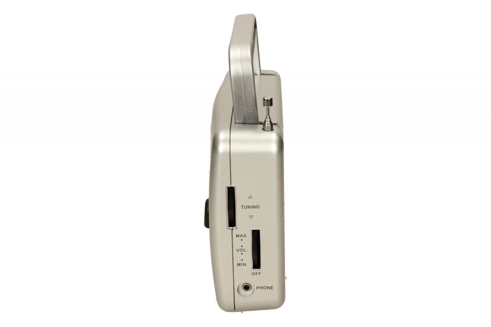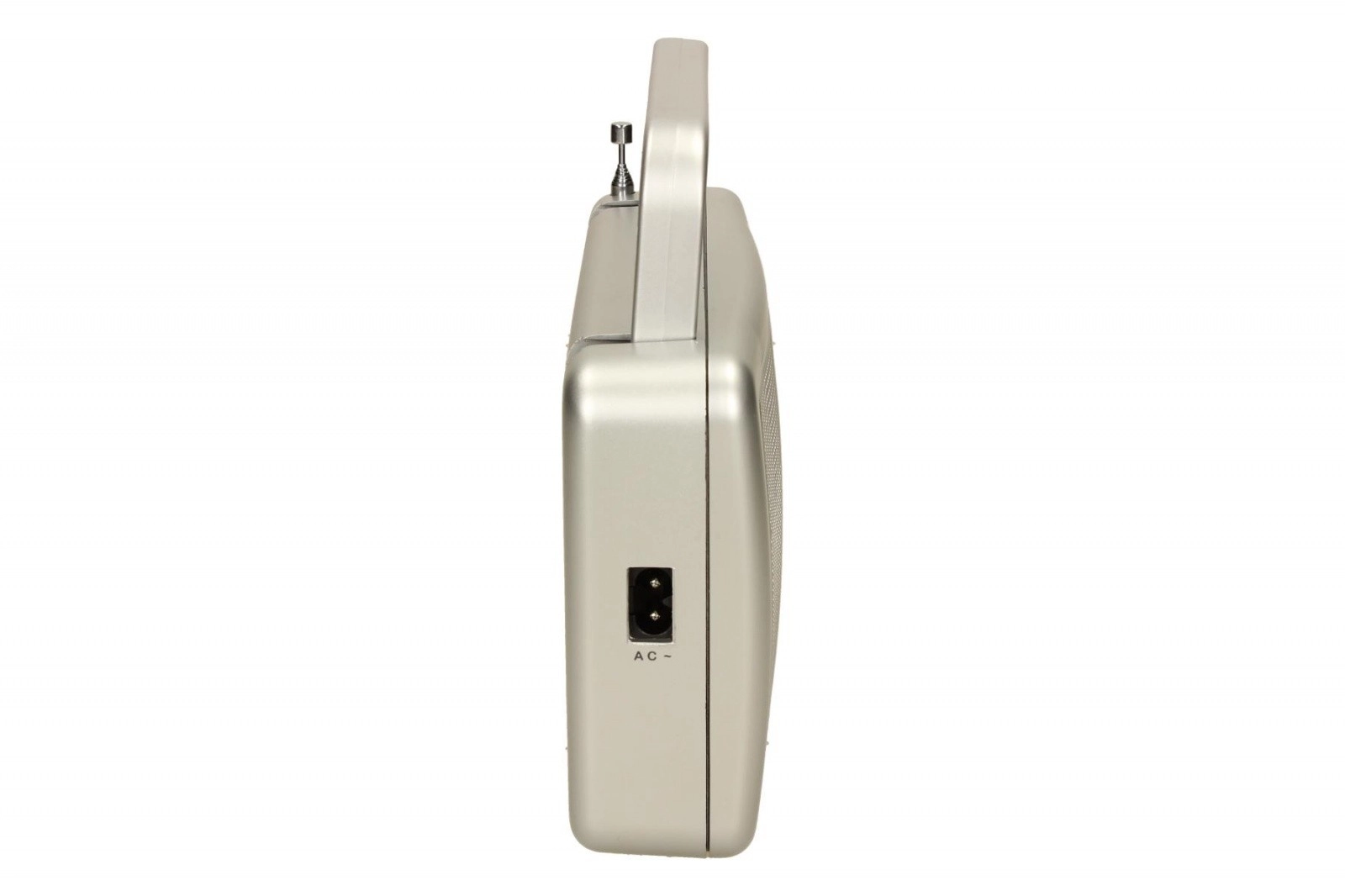 Stříbrné rádio se snadno čitelným ovládacím panelem nabízí skvělý výkon a elegantní vzhled.