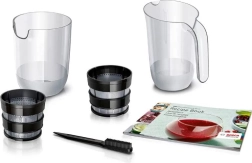 Všechny plastové části přicházející do styku s potravinami jsou bez BPA a lze je pohodlně umývat v myčce. Odolný, velmi tichý 150W motor s přibližně 55 ot./min zajišťuje vysokou výtěžnost šťávy s minimem hluku. Součástí je i kniha receptů plná nápadů na šťávy, smoothie a zdravé nápoje.