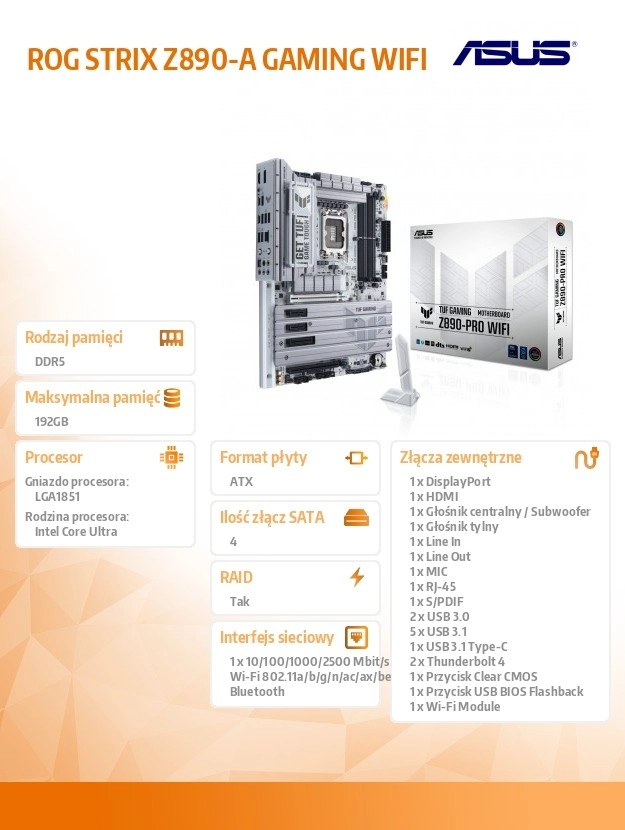 ASUS TUF Gaming Z890-PRO WIFI spojuje prvotřídní herní výbavu s armádní úrovní odolnosti. Vyladěné napájecí kaskády, promyšlené chladiče a robustní PCB zajišťují stabilitu i při dlouhých herních maratonech a náročném multitaskingu. Deska je navržena pro nejnovější procesory Intel Core Ultra (2. generace) a nabízí spolehlivý základ pro moderní PC.