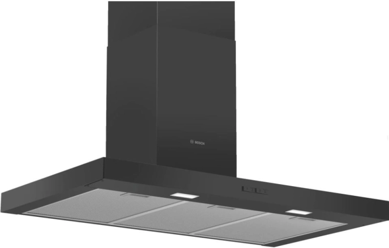 Tento černý odsavač par s elegantním kovovým povrchem je skvělým doplňkem pro současnou kuchyni.