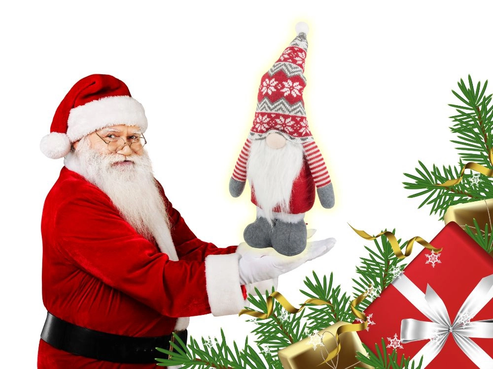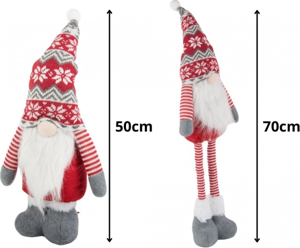 Vánoční skřítek s teleskopickými nohami 50–70 cm. Měkké materiály, stabilní provedení a útulný zimní design. Ideální dekorace na polici i pod stromeček.
