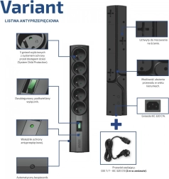 Lišta nabízí 5 uzemněných zásuvek se systémem Child Protection proti nechtěnému kontaktu, přehlednou LED signalizaci aktivní přepěťové ochrany a automatický jistič pro rychlé obnovení provozu bez výměny pojistky. Dvoupólový podsvícený vypínač umožňuje bezpečné a pohodlné odpojení celé lišty.