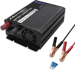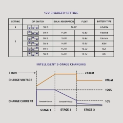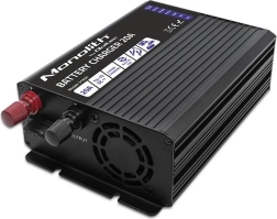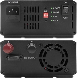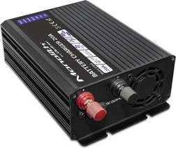 Díky DIP přepínači zvolíte z více režimů pro různé chemie: LiFePO4, AGM, GEL, SLA/olověné (včetně Ca, flooded) i režim stabilního napájecího zdroje. Odolné hliníkové šasi zajišťuje lepší odvod tepla, aktivní ventilátor chrání elektroniku při vysoké zátěži a po plném dobití se zařízení automaticky přepne do udržovacího/standby režimu.