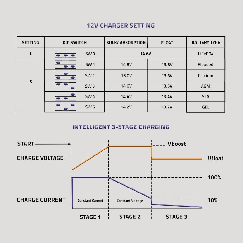 Pomocí DIP přepínače zvolíte optimální profil pro LiFePO4, AGM, GEL, SLA/olověné (včetně Ca, flooded) nebo režim stabilního napájecího zdroje. Jedna nabíječka pro více typů akumulátorů.