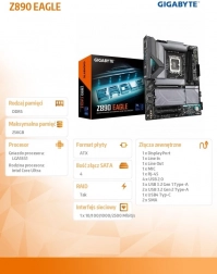 Výkonná základní deska GIGABYTE Z890 EAGLE pro patici LGA 1851 nabízí moderní výbavu pro nejnovější procesory Intel Core Ultra (2. generace). Přináší 14+1+2 fází VRM pro stabilní napájení, podporu DDR5 s XMP, až 4× M.2 včetně PCIe 5.0 x4, slot PCIe 5.0 x16 s vysokou odolností, a rychlou konektivitu USB4 Type‑C s DP‑Alt a 2,5 GbE LAN. Praktické prvky EZ‑Latch usnadní montáž bez šroubků a pokročilé chlazení zajistí stabilní výkon.