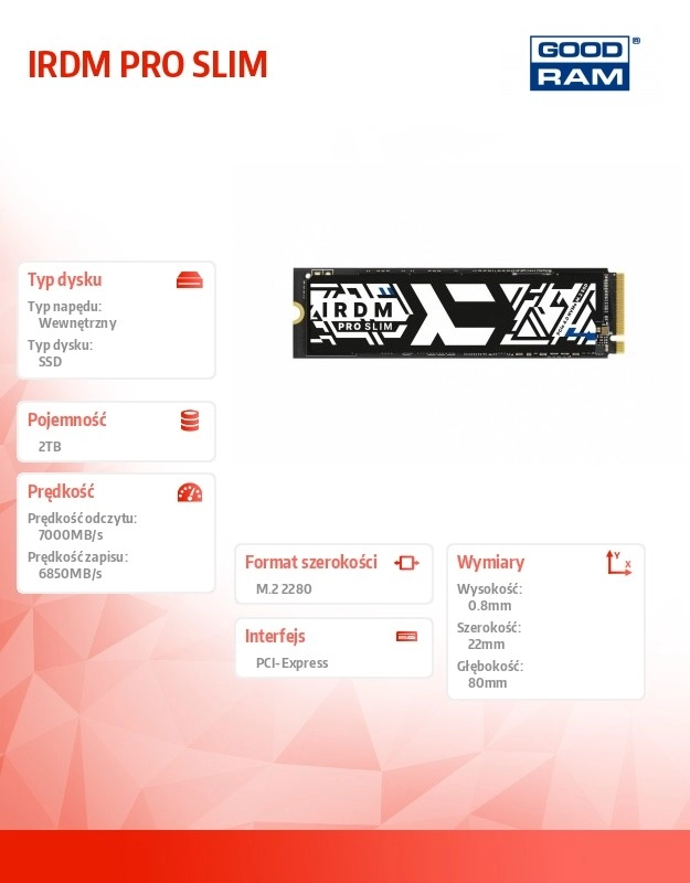 Výkonný SSD disk IRDM PRO SLIM s kapacitou 2 TB v rozhraní M.2 NVMe 2280 přináší bleskové rychlosti čtení až 7000 MB/s a zápisu až 6850 MB/s. Ideální pro herní konzole nové generace, výkonné notebooky i stolní PC, kde je klíčová stabilita, plynulost a spolehlivost při vysoké zátěži.